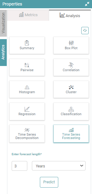 Step 3: Navigate to the Analytics tab on the right. Now click on the Analysis tab. Select “Time Series Forecasting” under Analysis in Properties. (Refer to the image below).