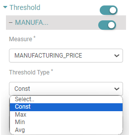 Step 1: Click on “Threshold” under Metrics. Enter the “Measure” for threshold. Next, Select the threshold type- “Const”, “Max”, “Min” or “Average”. (Refer to the image below).