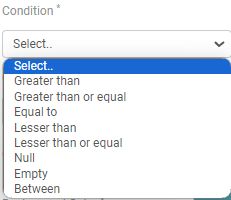 Step 2: Select any of the required conditions- “Greater than”, “Greater than or equal”, “Equal to”, “Lesser than”, “Lesser than or equal”, “Null”, “Empty”, or “Between” for the threshold. (Refer to the image below).