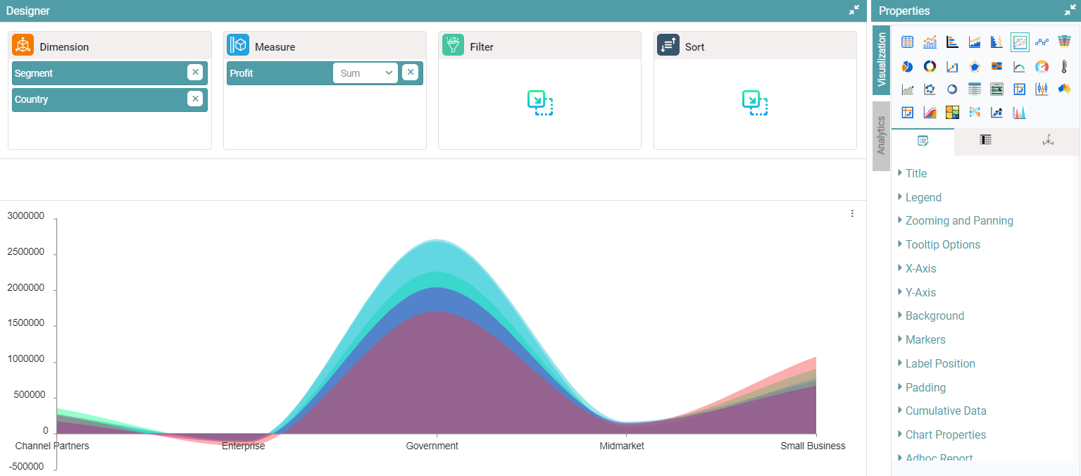 Step 2: Drag and drop the required columns in dimension and measure. The data represented will be in the form of an Area Chart. (Refer to the image below).