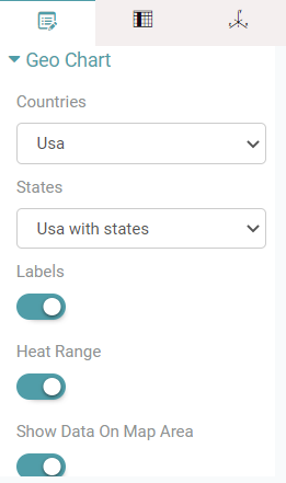 Step 3: Under properties click on geo chart option. The user can choose the Country, State, enable labels, heat range and can choose to show the data on map area. (Refer to the image below).