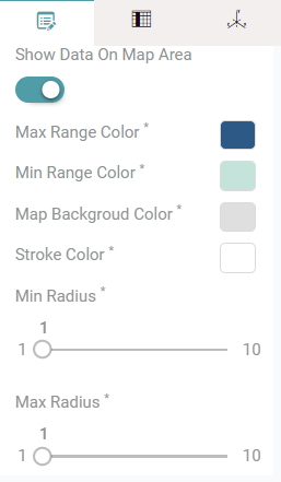 Step 4: Enable the show data on map area toggle and choose the max range color and min range color. You can also change the background color of the map, stroke color, min radius and max radius. (Refer to the images below).