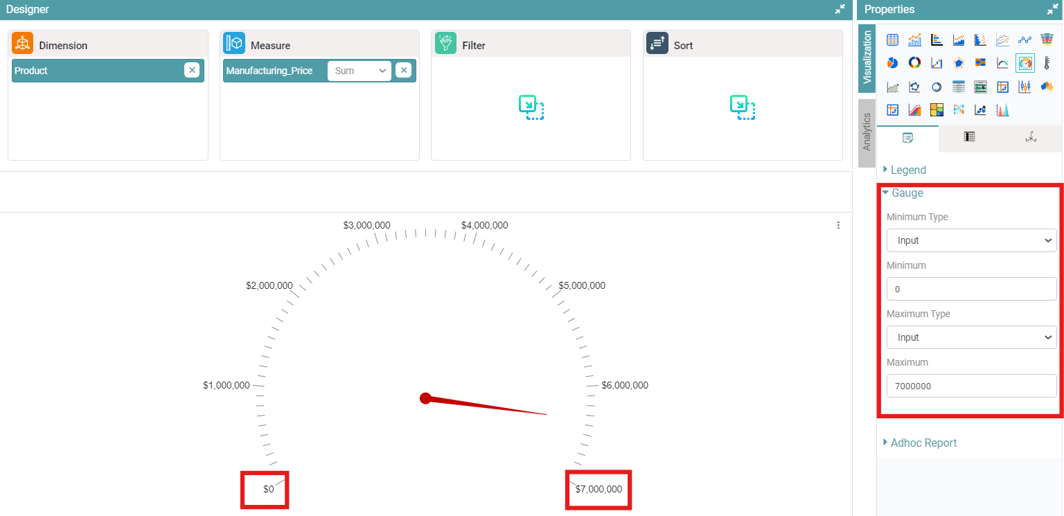Step 3: Enter the minimum and maximum value under Gauge. The chart will be represented in accordance to the values entered. (Refer to the image below).