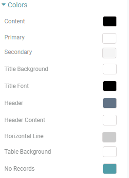 Step 4: You can customize the Content color, Primary color & Secondary color of alternate rows, Title background, Title font, Header color, Header content color, Horizontal line color, Table background color and the color of No records. (Refer to the image below).