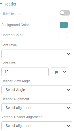 Step 4: You can Hide the headers, select the Background color, Content color, Header Font style, Header Font Size, Header view angle, Header Alignment, Vertical Header Alignment, Font weight, Row height and show the bottom border of the header. (Refer to the images below).