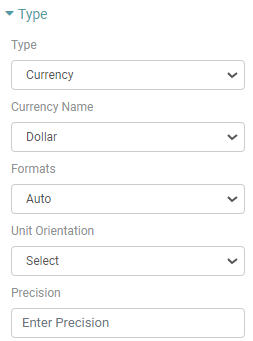 Step 4: Under the ‘Type’ dropdown, you will be able to choose currency, date, month, quarter, number and percentage.