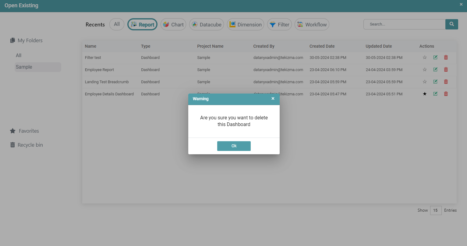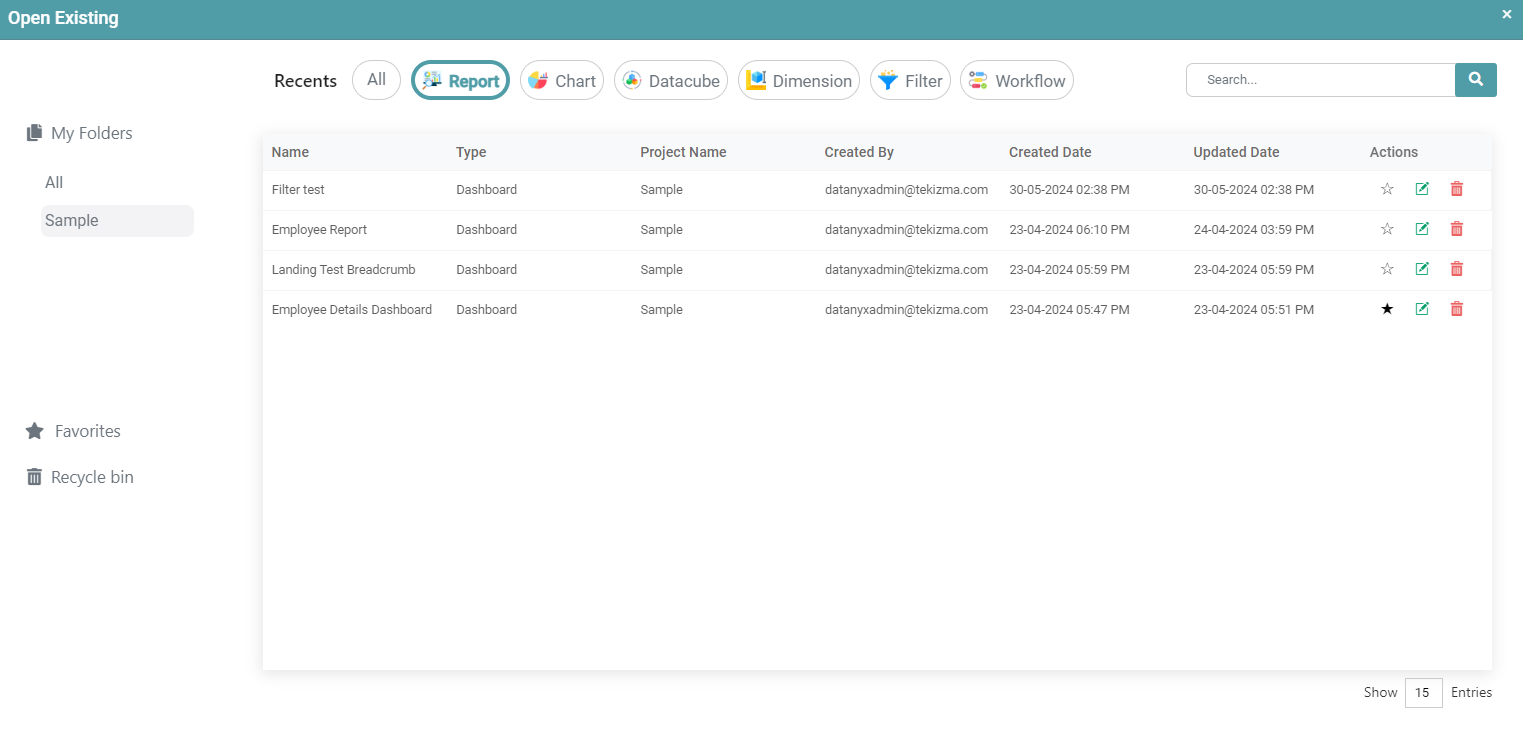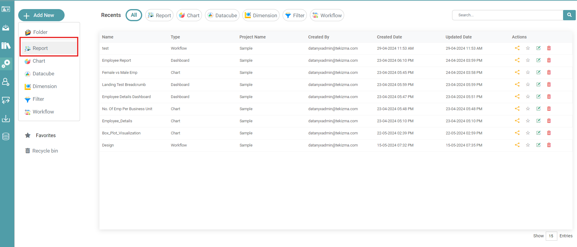 Step 11: You can add a new report, chart, workflow, dimension and filter to the current project by clicking on the add icon at the bottom. Click on Open Existing to open an old report.(Refer to the image below).