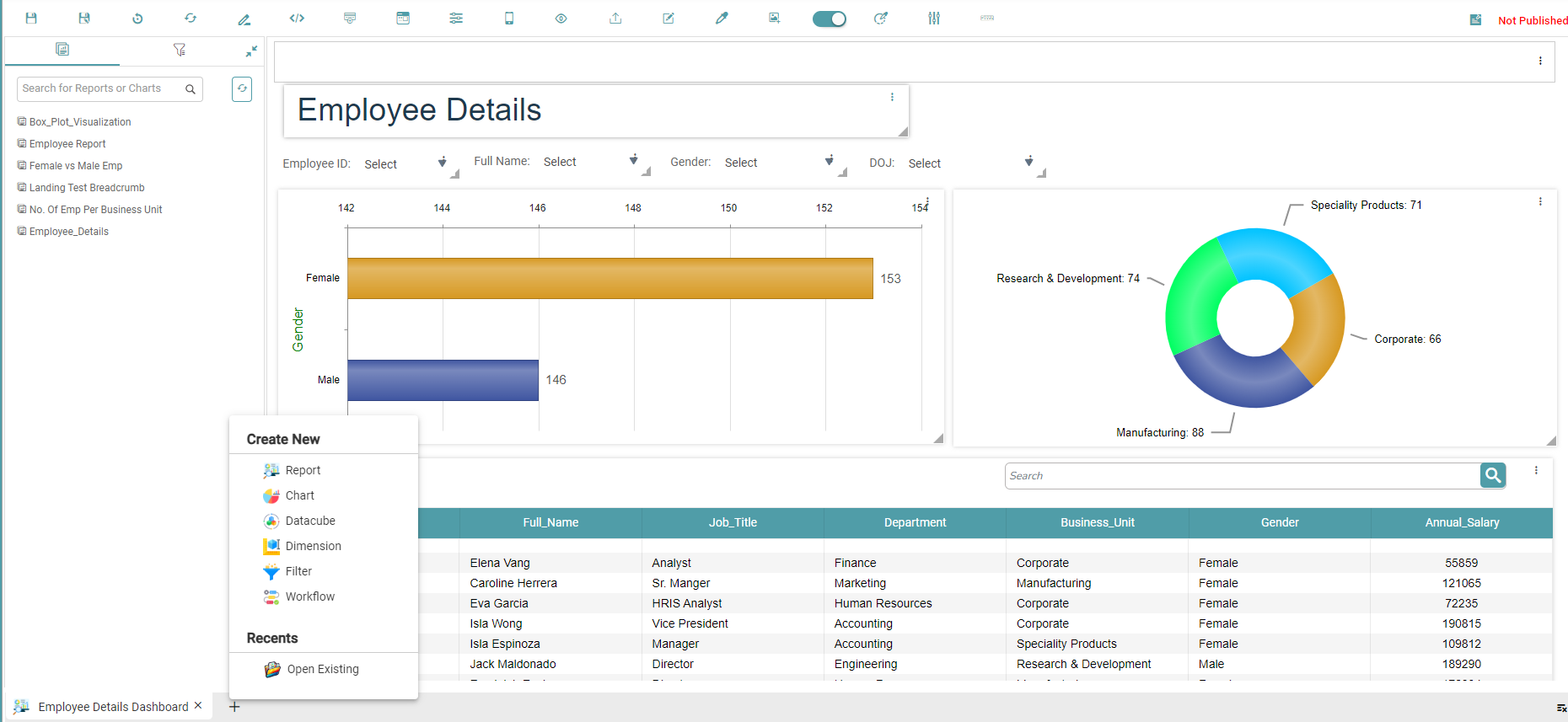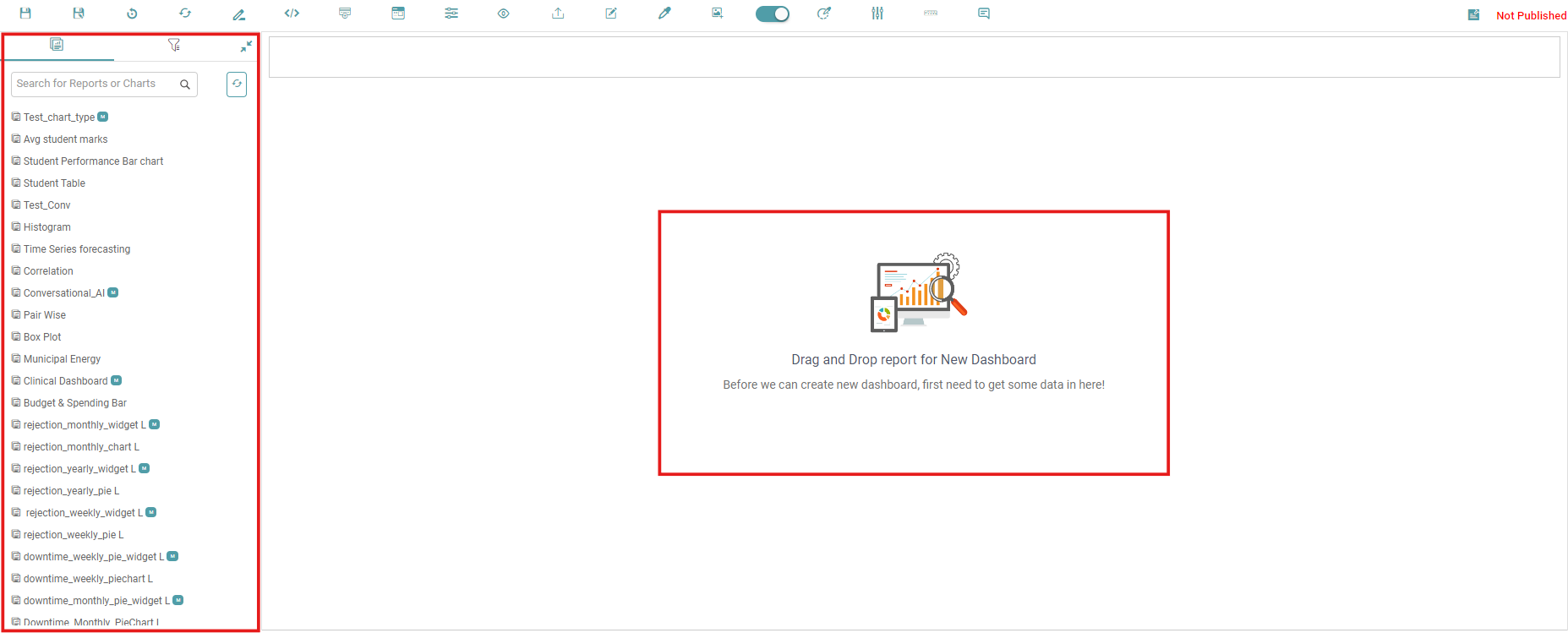Step 6: Now, Select the created Reports/Charts from the left navigation bar. Drag and drop the same on the main screen. (Refer to the image below).