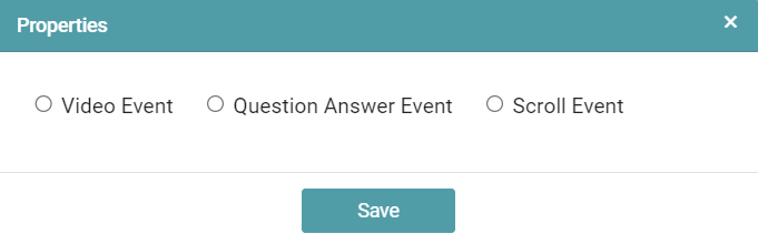 Step 3: Properties popup will appear, select any radio button option (video, question and answer or scroll event) and click save. (Refer to the image below).