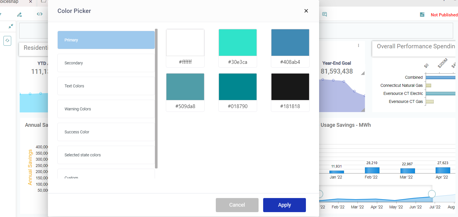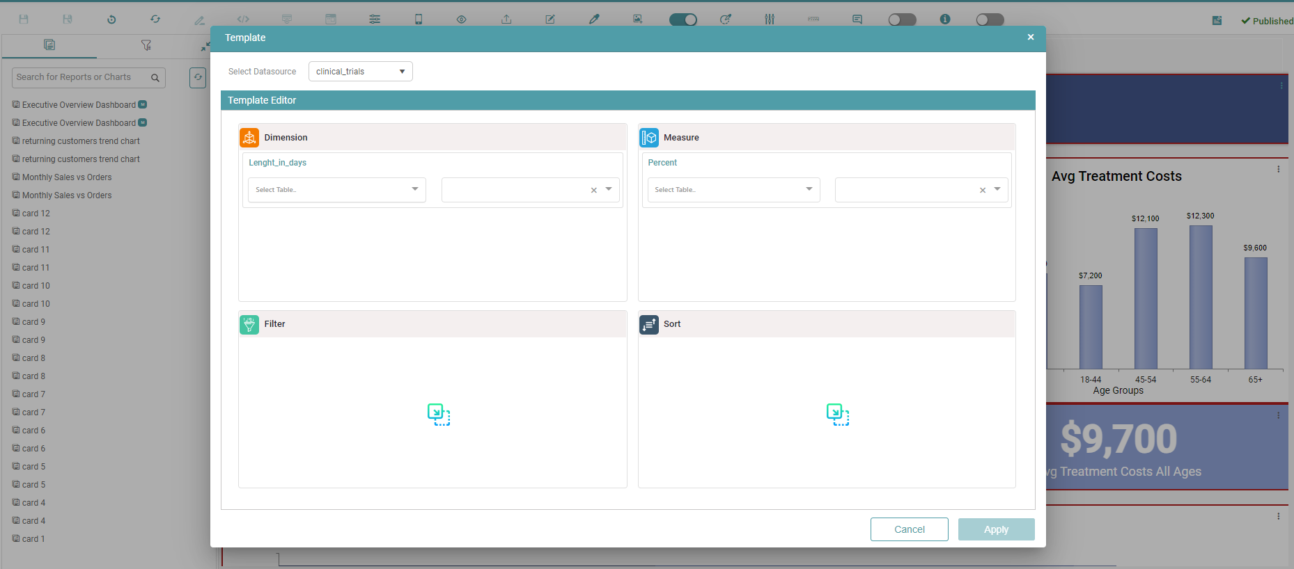 Step 4: The template pop up appears, make the necessary changes with respect to the Datasource, dimension and measure and click on apply. (Refer to the image below).