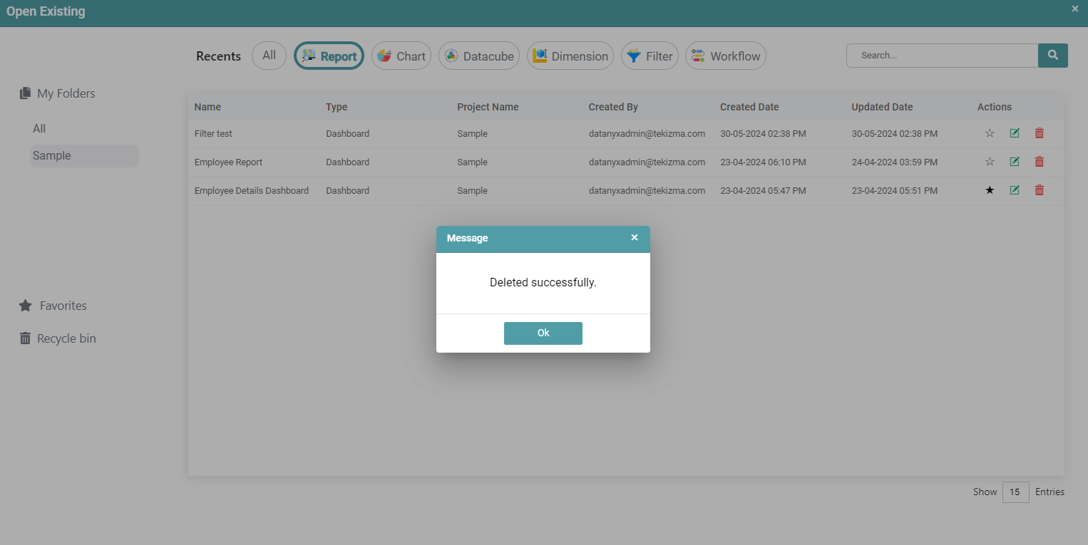 Step 6: You will get a message that the report has been successfully deleted. Click ok. The report has been deleted from the list. (Refer to the image below).