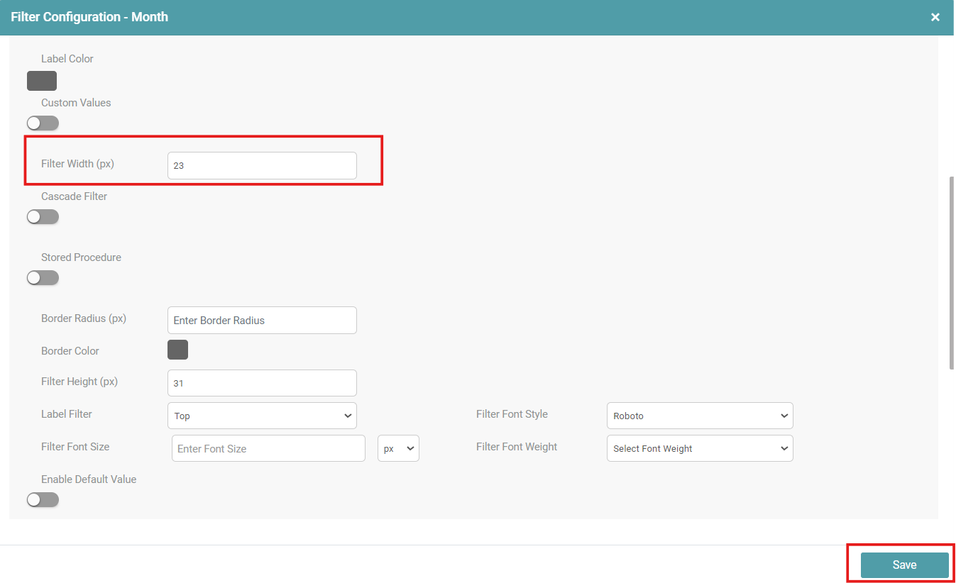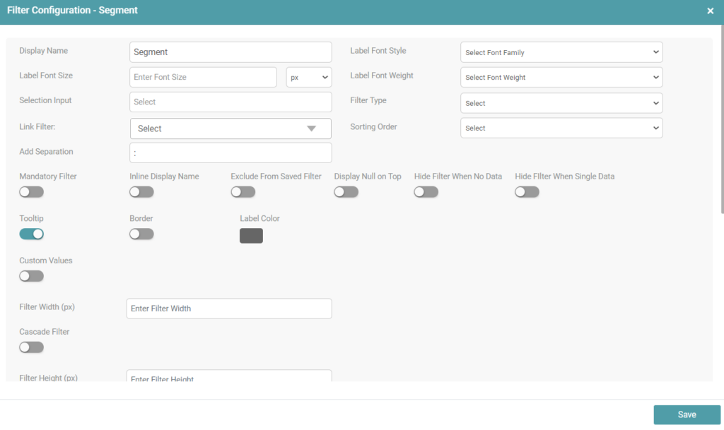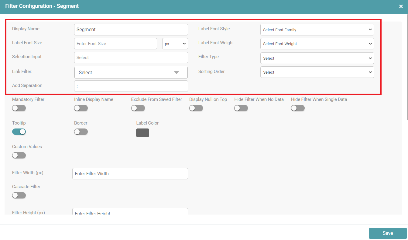 Step 3: You can customize the Display Name, Label Font Style, Label Font Size, Label Font Weight, choose a specific selection input that the filter ought to display, select the filter type, link the filter with other filters, select the sorting order and can also choose to add the separation between the filter label and the dropdown of the filter.