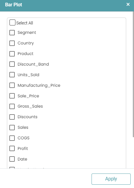 Step 3: Once a successful connection is made between ‘data import and bar plot’, click on the select button to choose the X and Y axis of the plot. A bar plot pop-up appears. (Refer to the images below).