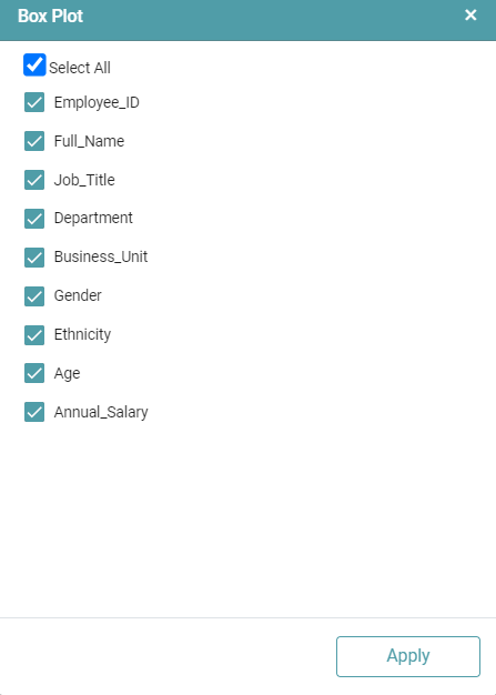 Step 3: Once a successful connection is made between ‘data import and box plot’, click on the select button. A pop-up appears with the columns present in the data.