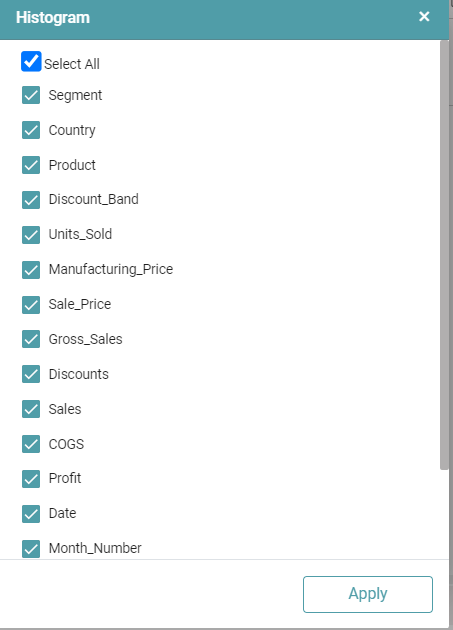 Step 3: Once a successful connection is made between ‘data import and histogram’, click on the select button. A pop-up appears with the columns present in the data.