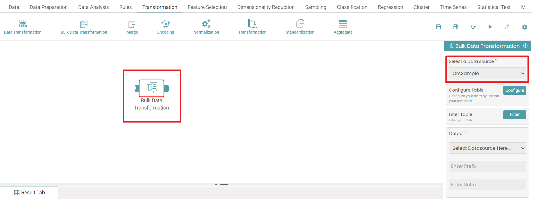 Step 2: Click on transformation. Drag and drop the bulk data transformation node onto the main screen. Select the data source by clicking on the ‘Select a Data Source’ dropdown. (Refer to the image below).