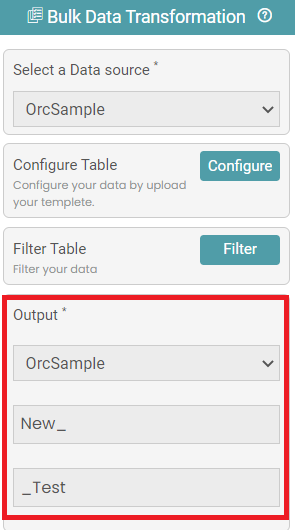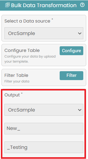 Step 7: Click on the output dropdown and select the data source. Enter the prefix and suffix for the data source. (Refer to the image below).