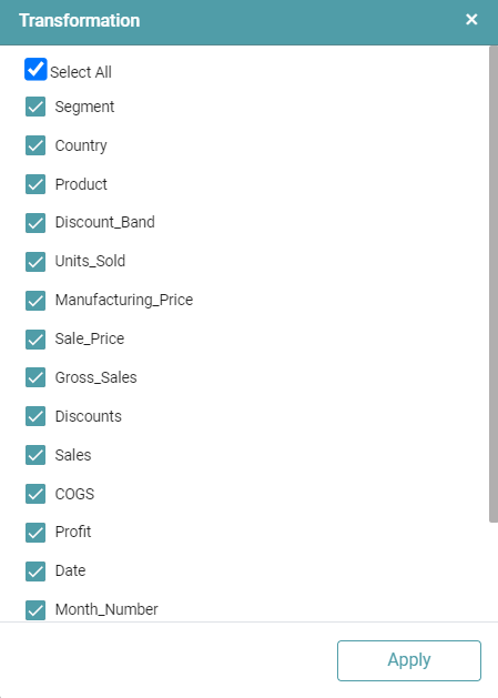 Step 4: A pop-up appears with the columns present in the data. Click on ‘Apply’.