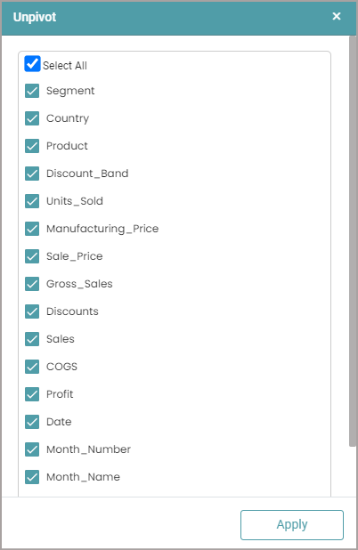 Step 3: Click on the select button from ‘Unpivot’. A pop-up appears where the user can select the columns required. Click on ‘Apply’ (Refer to the image below).