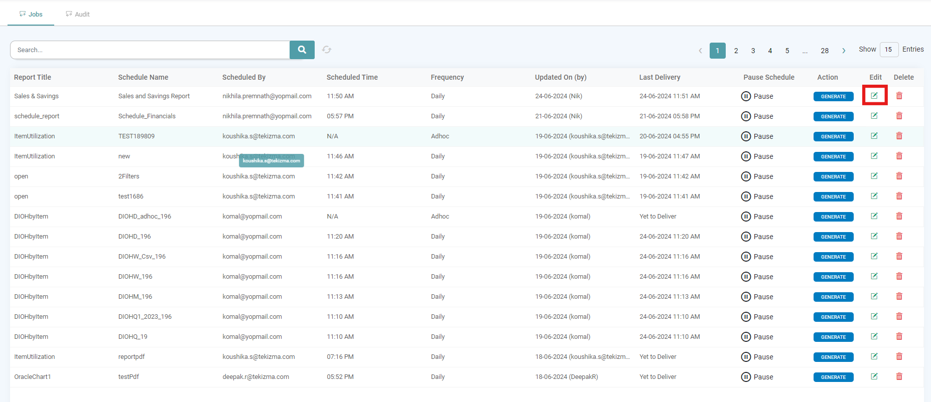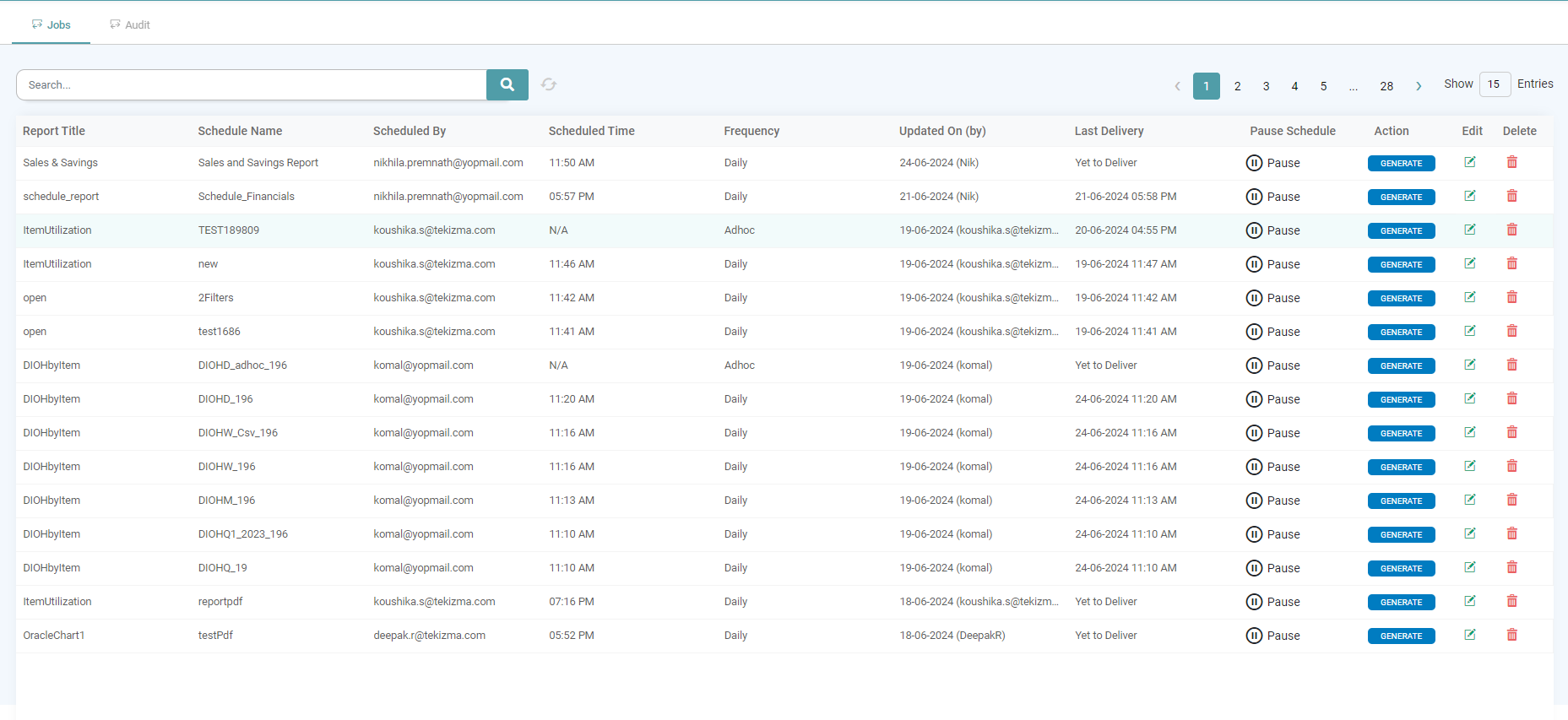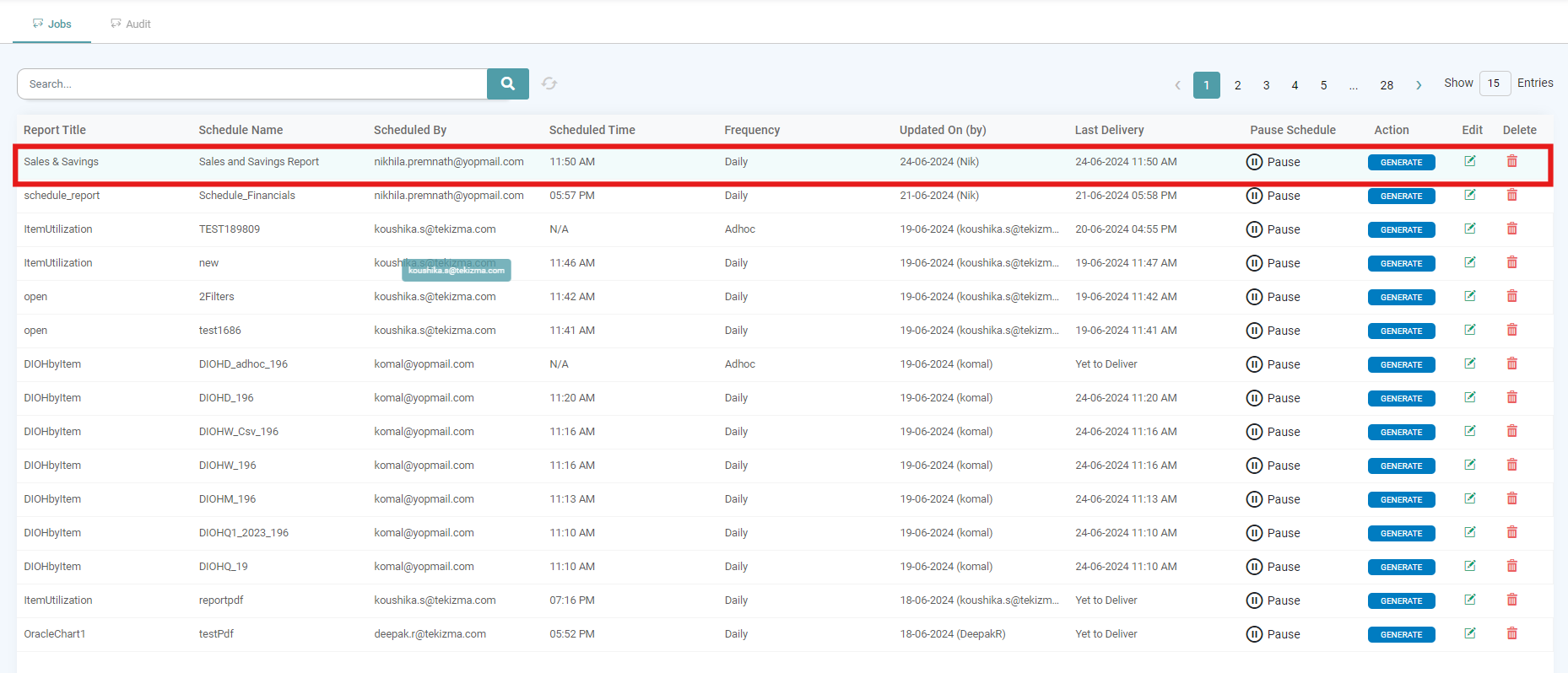 Step 14: The details about the Report Title, Schedule Name, Scheduled By, Scheduled Time, Frequency, Updated On (by), Last Delivery, Pause Schedule, Action, Edit and Delete will be available to the user. (Refer to the image below).