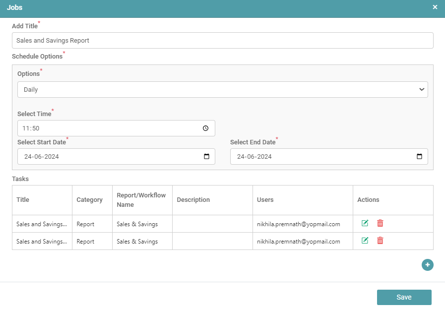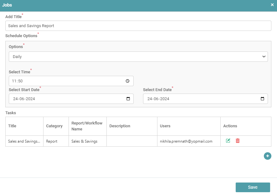 Step 12: The Task or Tasks you have configured will be listed under Tasks. Click on the save button. (Refer to the image below).