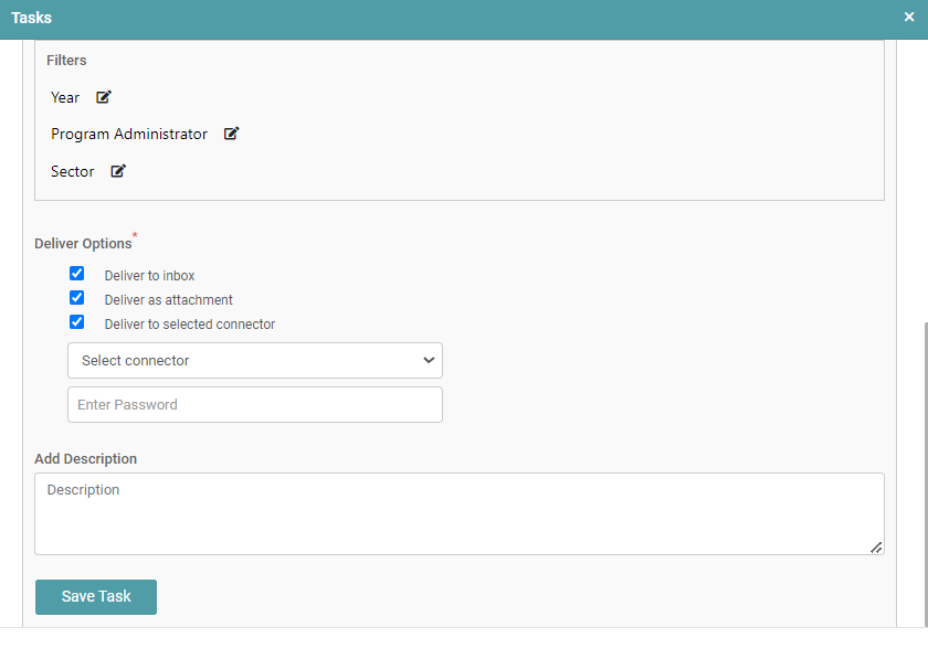 - Deliver to selected connector – Select the Connector and enter the password.