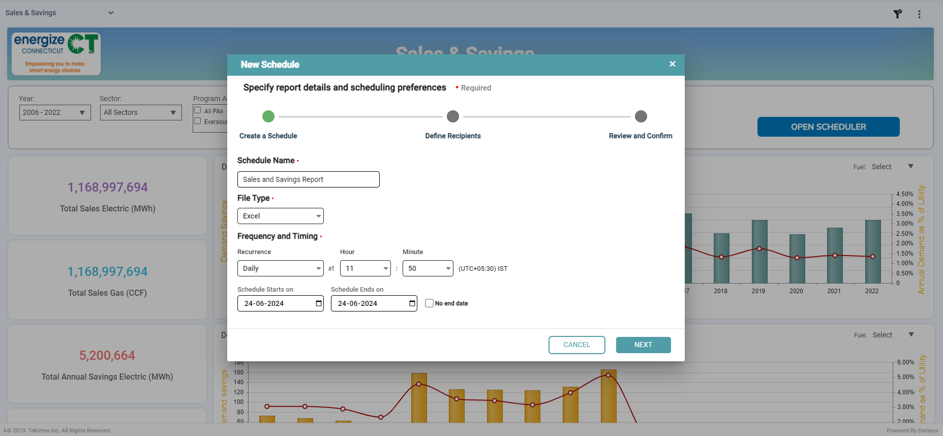 Click on the schedule icon to start creating a new schedule. Enter the schedule name, select the required file type, and set the frequency and timing by choosing recurrence and start date. Once the details are filled, click on next. (Refer to the image below).