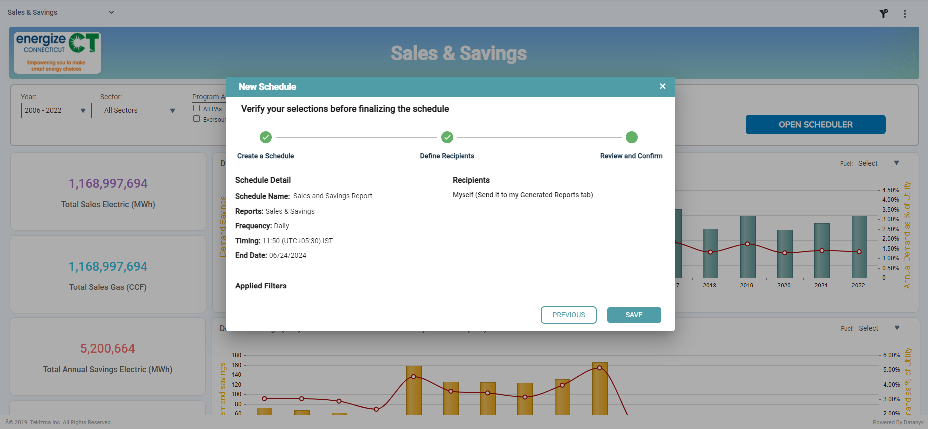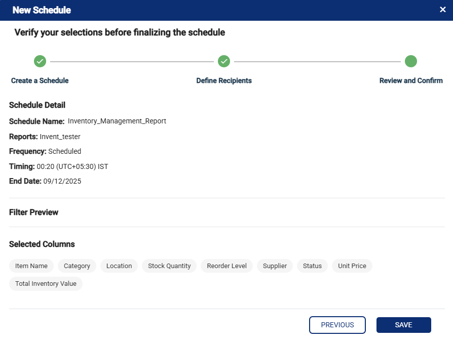 Verify the schedule details including schedule name, selected report, frequency, timing, filters applied, and selected columns. Once reviewed, click on save to complete the schedule creation. (Refer to the image below).