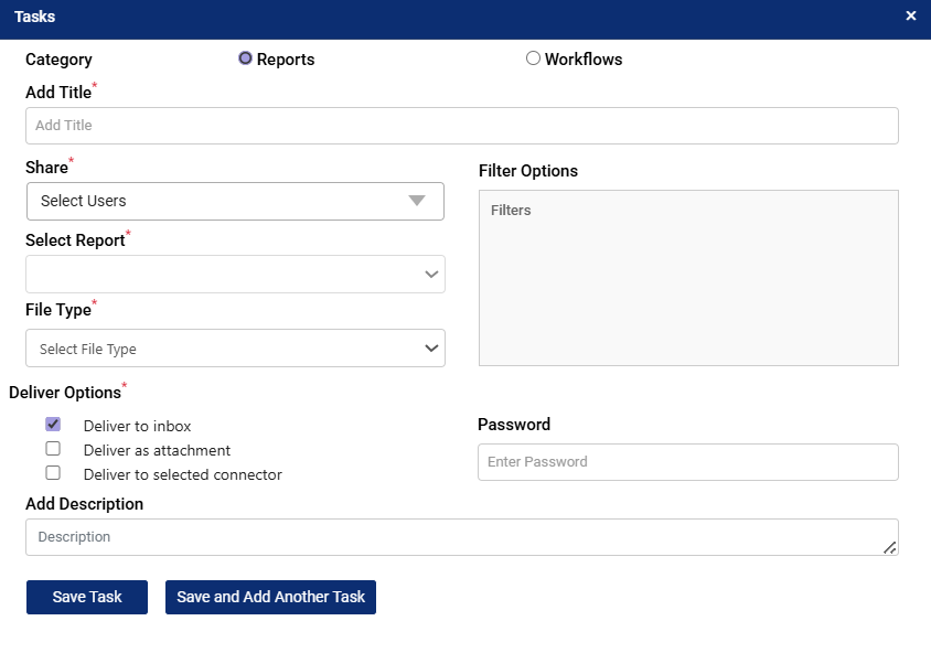 - Add Password (Optional). Enter a password if you want to secure the delivered file. The recipient will need this password to open the report.