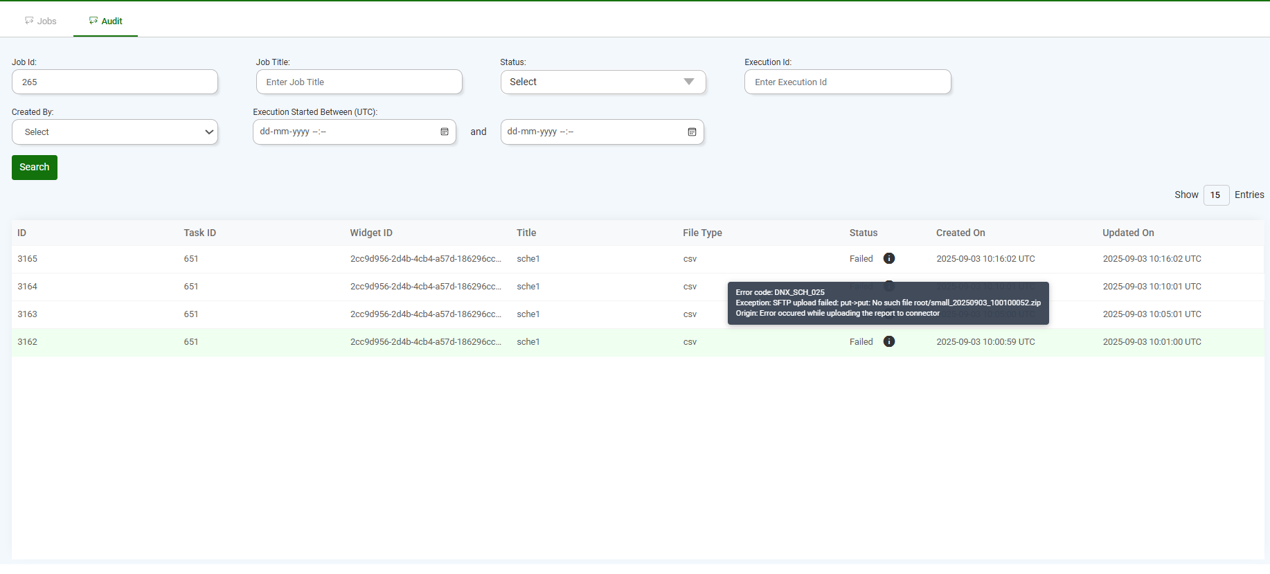 If a job fails, the Status will show as Failed. When you hover over the failed job, the system displays the error message for that job. (Refer to the image below).