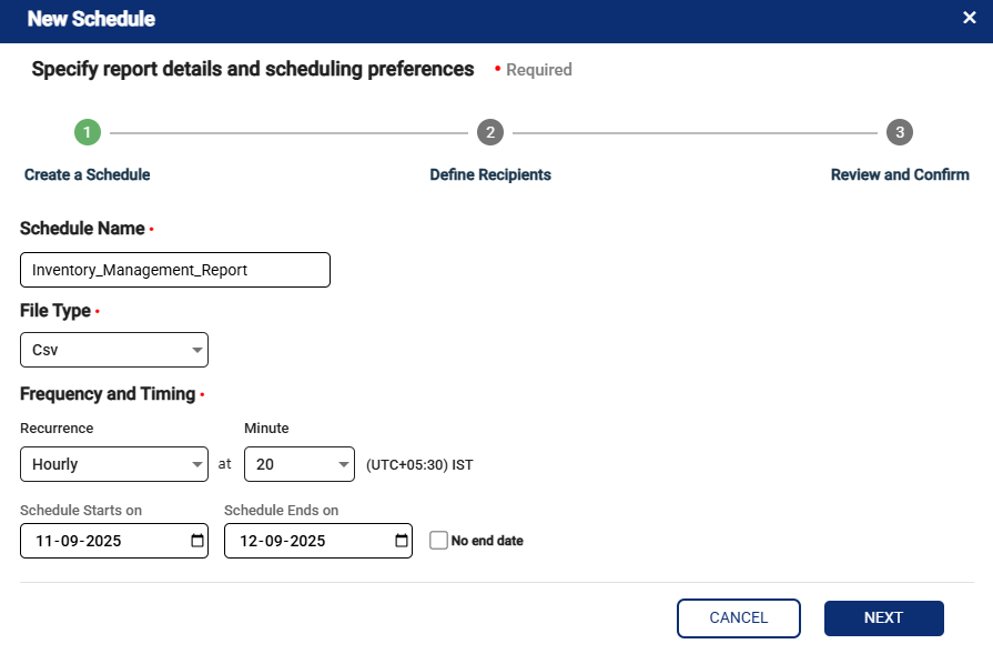 Step 3: Here, you can enter the Schedule Name, choose the File Type (CSV, Excel, or PDF), set the Frequency (Daily, Weekly, Monthly, Adhoc), specify the Timing, select the Schedule Start Date, and set the Schedule End Date. If there is no end date, click the “No End” checkbox. Then, click the “Next” button. (Refer to the image below).