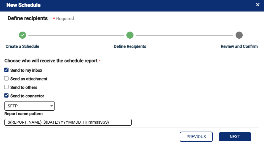 Select how the scheduled report should be delivered by choosing from the available options: send to inbox, send as attachment, send to others, or send to connector. Enter the report name pattern as required and then click on next. (Refer to the image below).