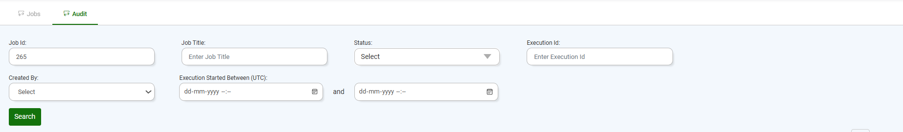 In the Audit tab, you can see the list of jobs along with their details such as Job ID, Task ID, Widget ID, Title, File Type, Status, Created On, and Updated On. (Refer to the image below).